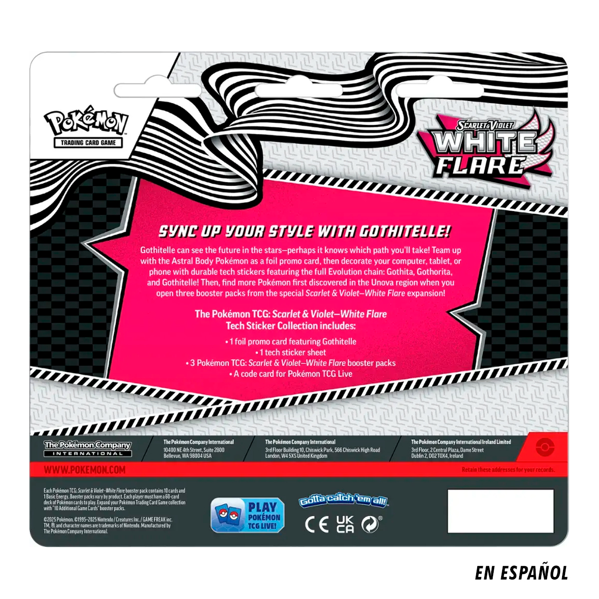 Gothitelle puede ver el futuro en las estrellas, ¡quizás sepa qué camino tomarás! Combina con el Pokémon Cuerpo Astral como carta holográfica de promoción y decora tu ordenador, tableta o teléfono con pegatinas tecnológicas resistentes con la cadena de evolución completa: Gothita, Gothorita y Gothitelle. ¡Descubre más Pokémon descubiertos en la región de Teselia al abrir tres paquetes de mejora de la expansión especial Escarlata y Violeta—Llama Blanca!
