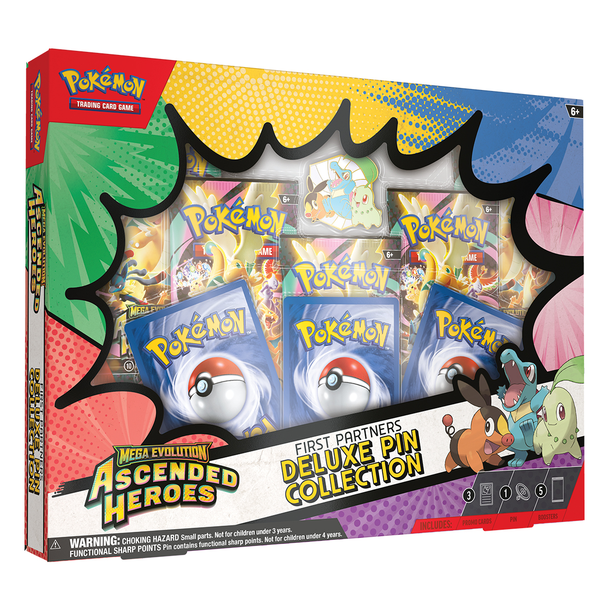 Antes de embarcarte en una nueva aventura, ¡es esencial elegir un primer compañero Pokémon! Con esta caja, podrás hacerte amigo de Chikorita de tipo Planta, Tepig de tipo Fuego y Totodile de tipo Agua como cartas holográficas promocionales y como un pin de lujo que luce a los tres Pokémon juntos en esmalte brillante. ¡También recibirás cinco paquetes de mejora de la expansión especial Megaevolución: Héroes Ascendidos!