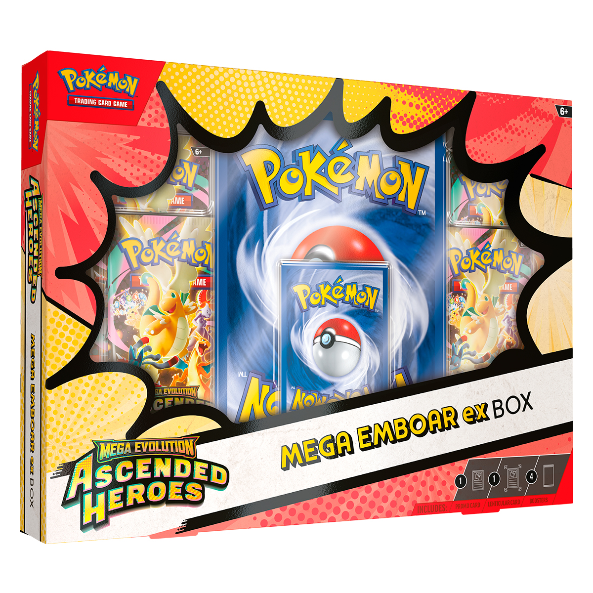 ¡Forja un vínculo que lleva la fuerza de tu compañero Pokémon al límite con la Megaevolución! En esta caja, encontrarás a Mega Meganium ex, Mega Emboar ex o Mega Feraligatr ex como carta holográfica de promoción jugable, junto con una carta lenticular de gran tamaño con ilustraciones dinámicas y cuatro paquetes de mejora de la expansión especial Megaevolución: Héroes Ascendidos.