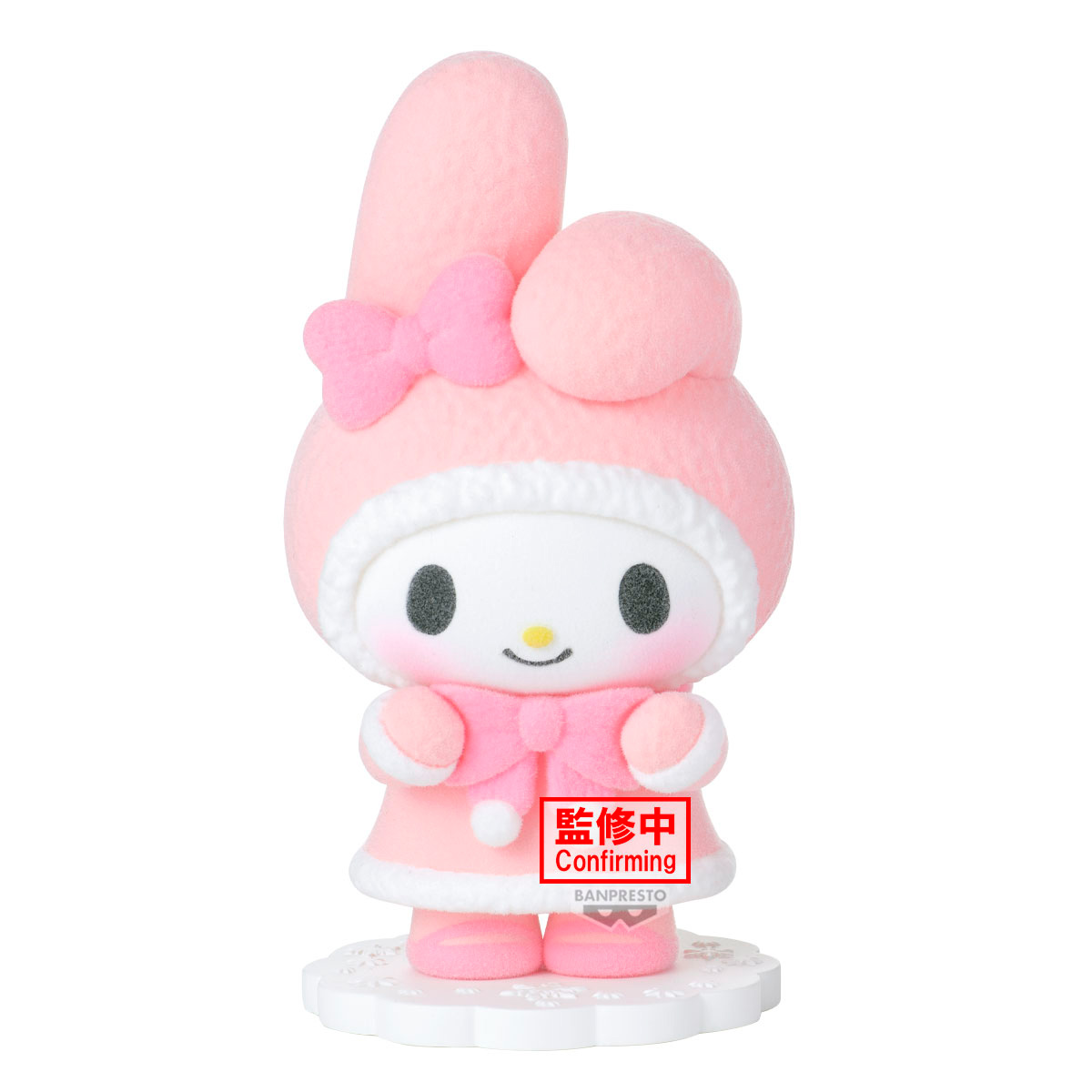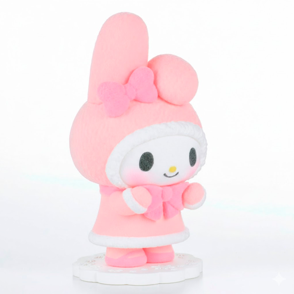My Melody aparece en una adorable figura de acabado aterciopelado, con colores pasteles y detalles delicados que resaltan su ternura. Su textura suave y su pose dulce la convierten en una pieza especial para cualquier amante de Sanrio.